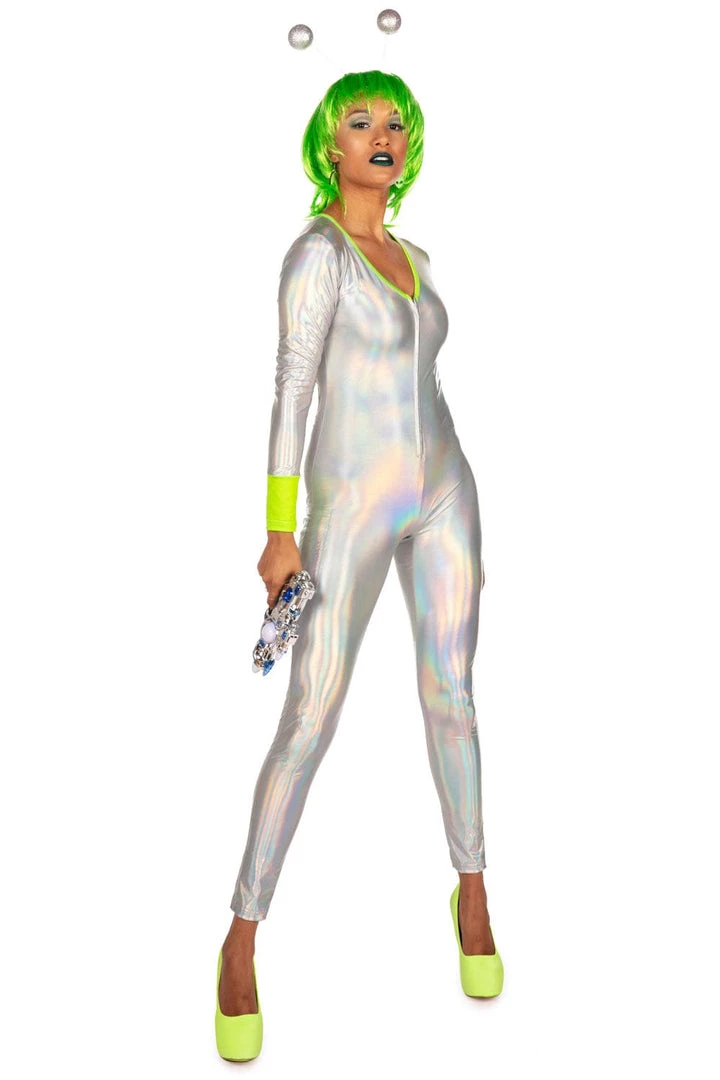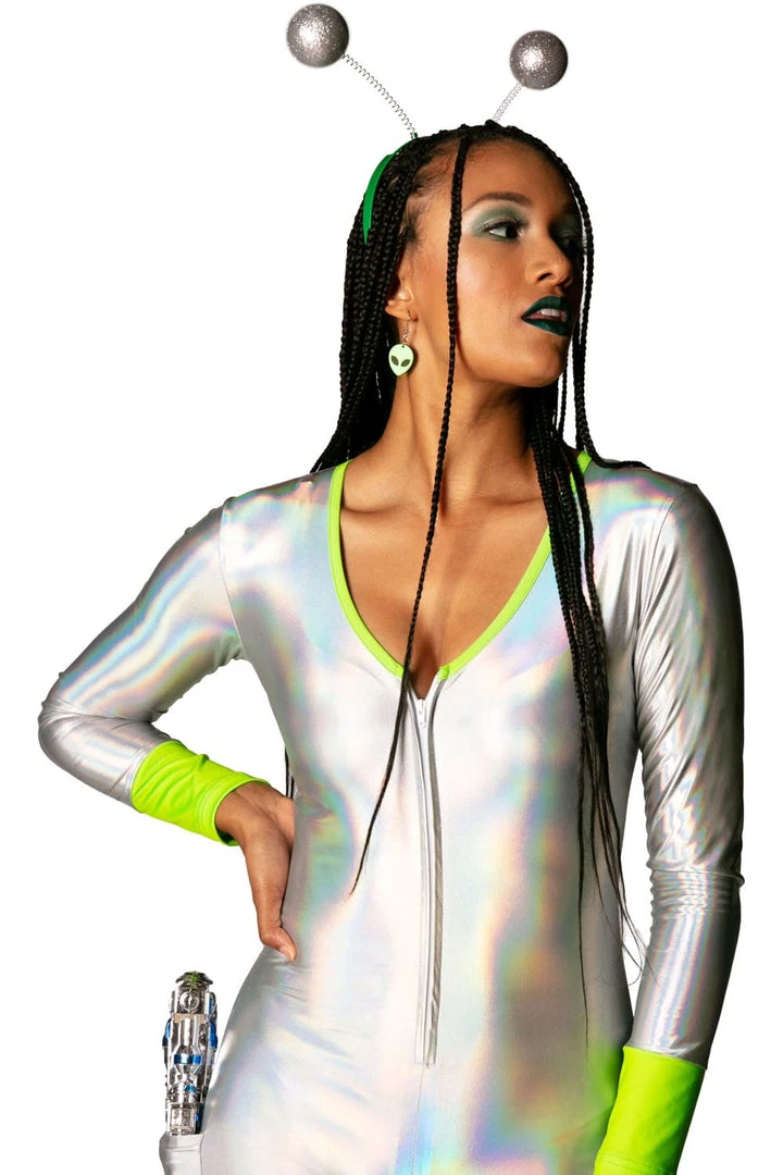 Need a Halloween costume that’s totally out of this world? We hear ya. That’s why we’ve created this Women’s Alien costume, making you look straight-up intergalactic fantastic. Make your entrance in your spaceship and dazzle your fellow party goers with this uber neon, reflective one-piece. It’s part extra-terrestrial, part disco, and full funky. With bright green sleeves and collars, you’ll stand out among the ghouls and zombies. They might be from another planet, but you’re from a whole different galaxy, honey. Having a bad hair day? Fret not, little Area 51 dweller – you can cover it all up with the green wig and antennae. It’s all included, and no alien would leave the space station without it. Feel free to add your own finishing touches from our accessories collection, like disco ball earrings to liven up the party! Who knew aliens had such awesome moves? Beam yourself up to dance floor queen status.