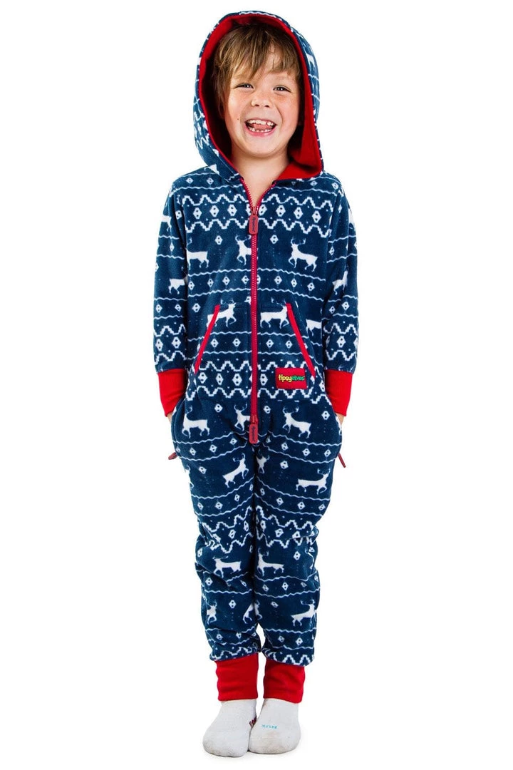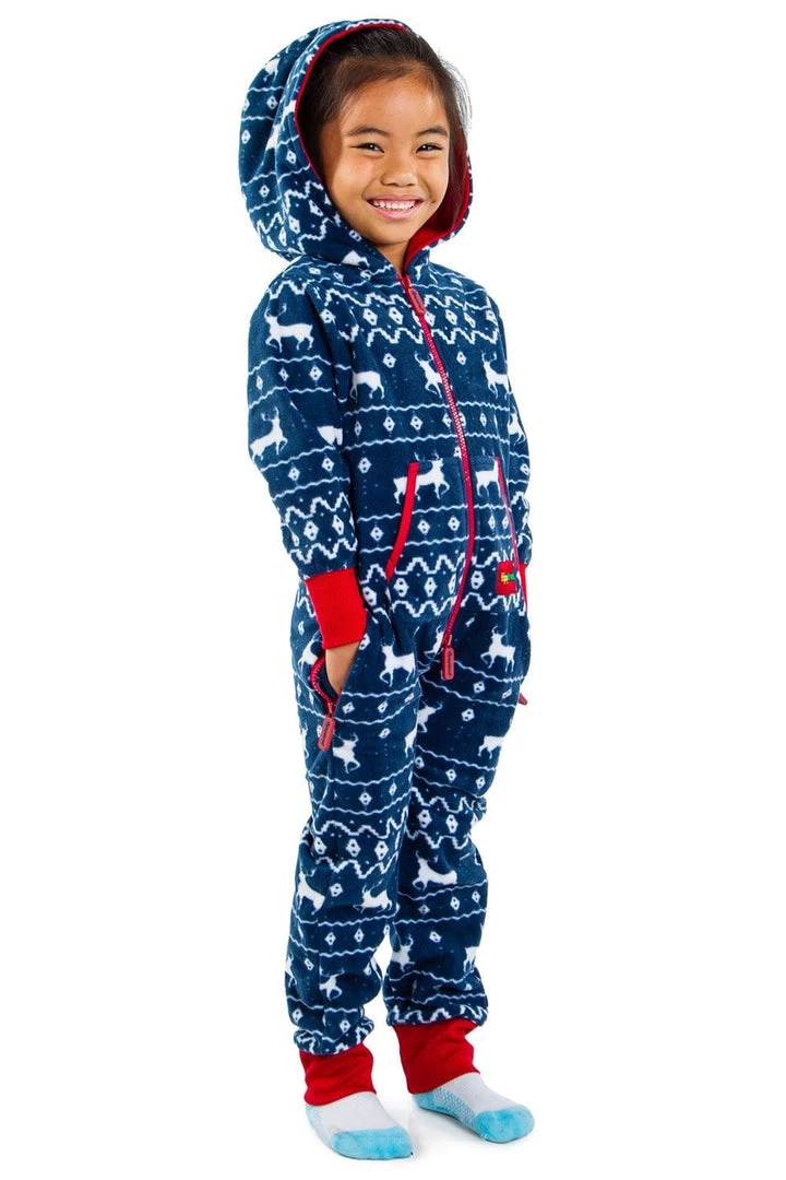 What should your kiddos wear out to play in the snow? We vote for this blue jumpsuit with its cute white reindeer. There are all kinds of possibilities for taking photos and making memories with the family in this versatile and comfortable apparel. With its Fair Isle pattern, this jumpsuit will be a wardrobe favorite throughout the holiday season.