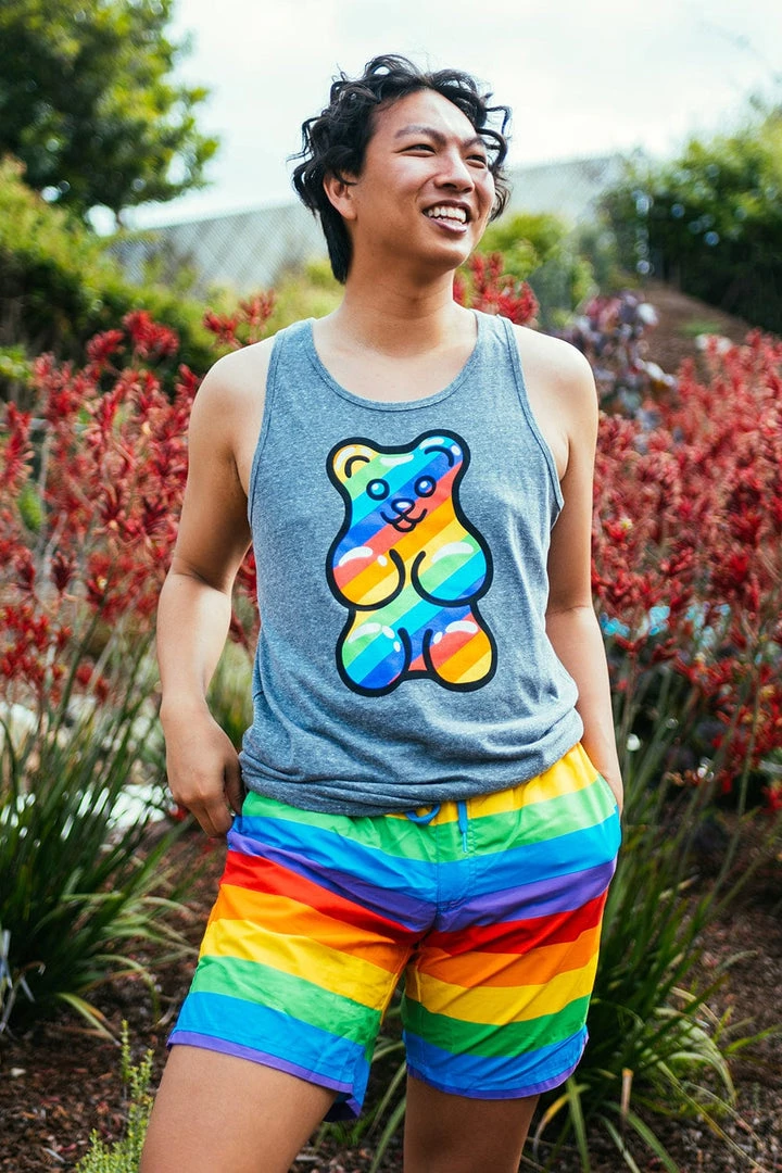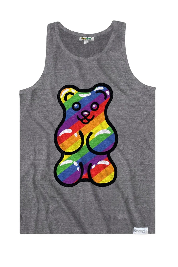 Who doesn’t love a gummy bear? They’d be our go-to snuggle toy if they weren’t so damn delicious. For this year’s Pride, we’re cramming you full of sticky love and colorful hugs with this (Men’s) Gummy Hunny tank top. Throw it on and get your sugar rush – your public is waiting.