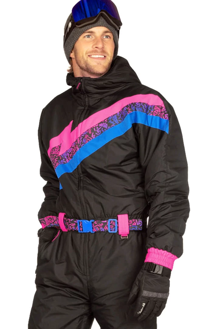 Black is easy to spot against the white snow-and it’s also super slimming which is hard to accomplish in a ski suit. But it’s the hot pink and royal blue detailing on our eighties inspired ski gear that will really catch your eye. That Z shaped icon stands for the cartoon character style zooming sound you’ll make as you zip down the slopes.