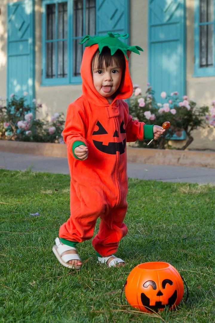 Do you suck at pumpkin carving? Why not take the hassle out of Halloween pumpkins this year with our baby pumpkin costume? This super cute orange jumpsuit will make all your Halloween party guests swoon, complete with an authentic green lid and even a classic Halloween pumpkin smile. Ideal for trick or treaters, the toddler pumpkin costume will be a hit with the neighbors as you make your way around this Halloween. Alternatively, why not buy a baby pumpkin costume a couple of sizes up for extra candy storage room? Whatever size you need, the infant pumpkin costume definitely tops the list of cute Halloween costume ideas. It comes with a convenient zipper from neck to ankle to help your little ones climb in and out with ease, making it ideal for running around or taking a nap. Pair with an adult pumpkin costume for an adorable Halloween family photo.
