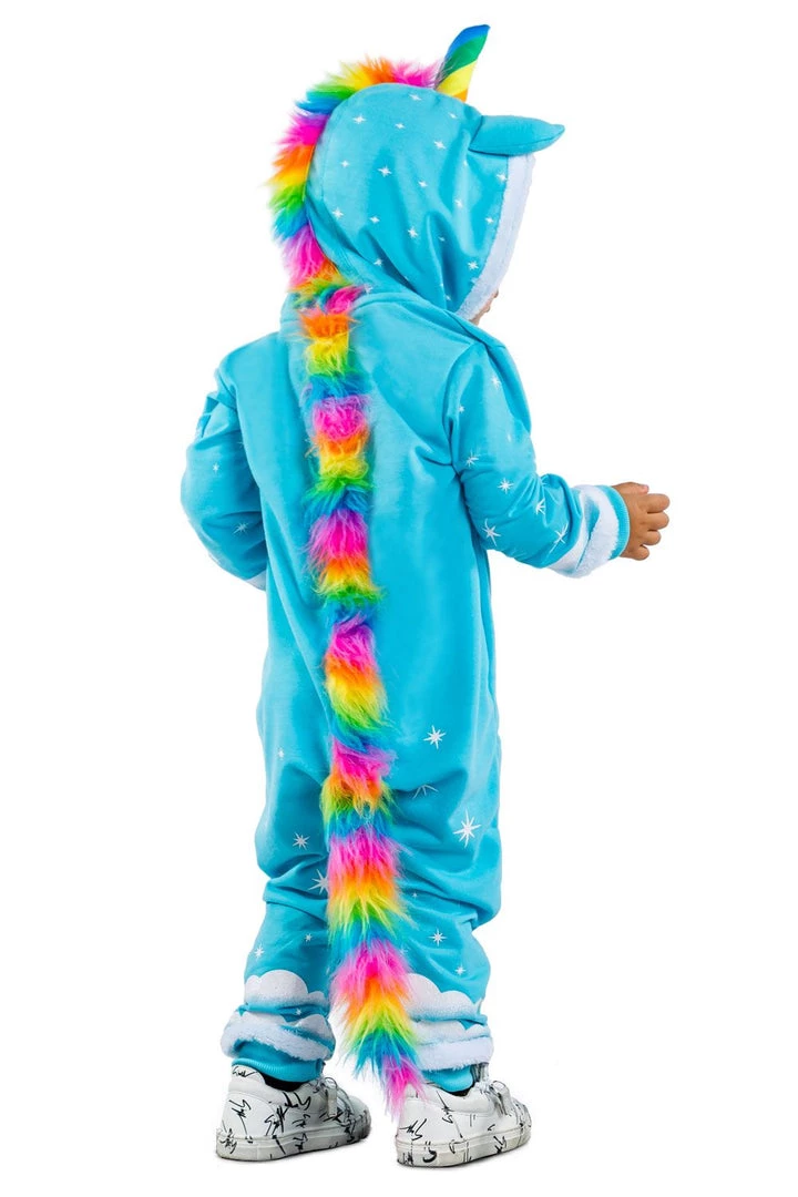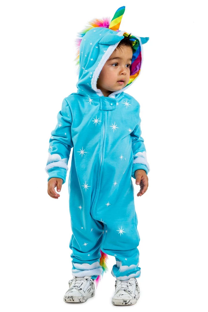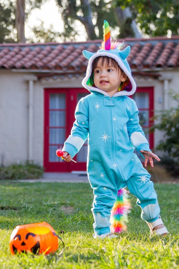Our baby unicorn costume is the thing dreams are made of – when you dress your little one in this funky jumpsuit, they’ll be transported to a land of trolls and fairies. Or, they might just be a great talking point at your Halloween party, but either way, the baby unicorn costume is one of the cutest in our Halloween collection. You won’t find blood and guts on this infant unicorn costume – just clouds, stars and a bright blue design that (hopefully) won’t make your party guests cry. With a variety of sizes available from baby through to toddler unicorn costume size, it makes a perfect sleep suit or party costume to watch them running around in. For older kids, why not load them up on Halloween candy and watch your little unicorns run wild, or for babies, put them down for a nap while you chomp on your favorite treats.