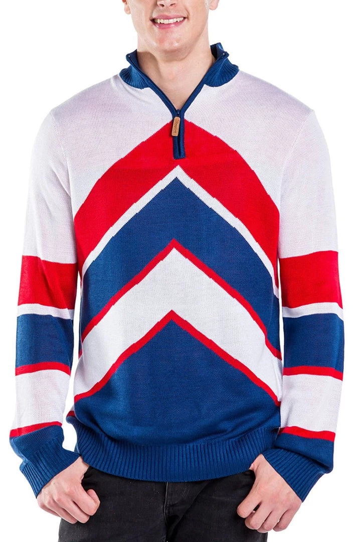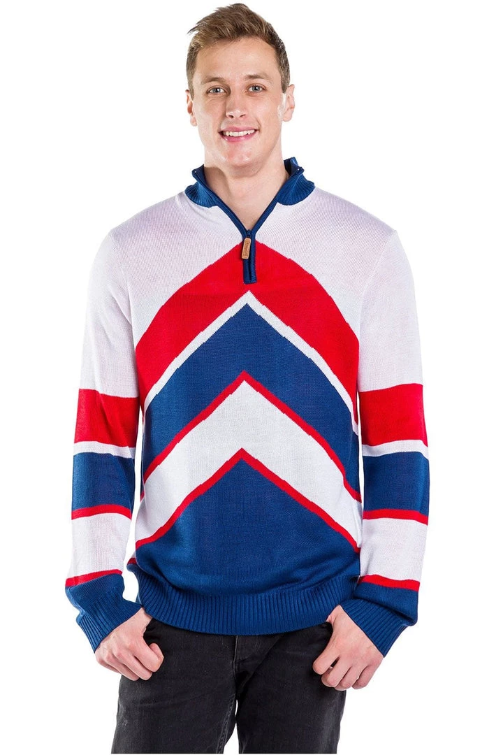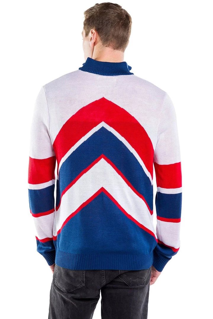 There’ll be no mistaking you when you hit the slopes in this All American Sweater. Make like Tipsy Elves’ sponsored skier Jonny Moseley with this USA chevron pattern half zip sweater. Just like Jonny shredded his way to Olympic gold back in ’98, you can represent your country with pride in our daring red, white and blue sweater. Slay it under a ski suit or just chill in the ski lodge and let people know how awesome you are.