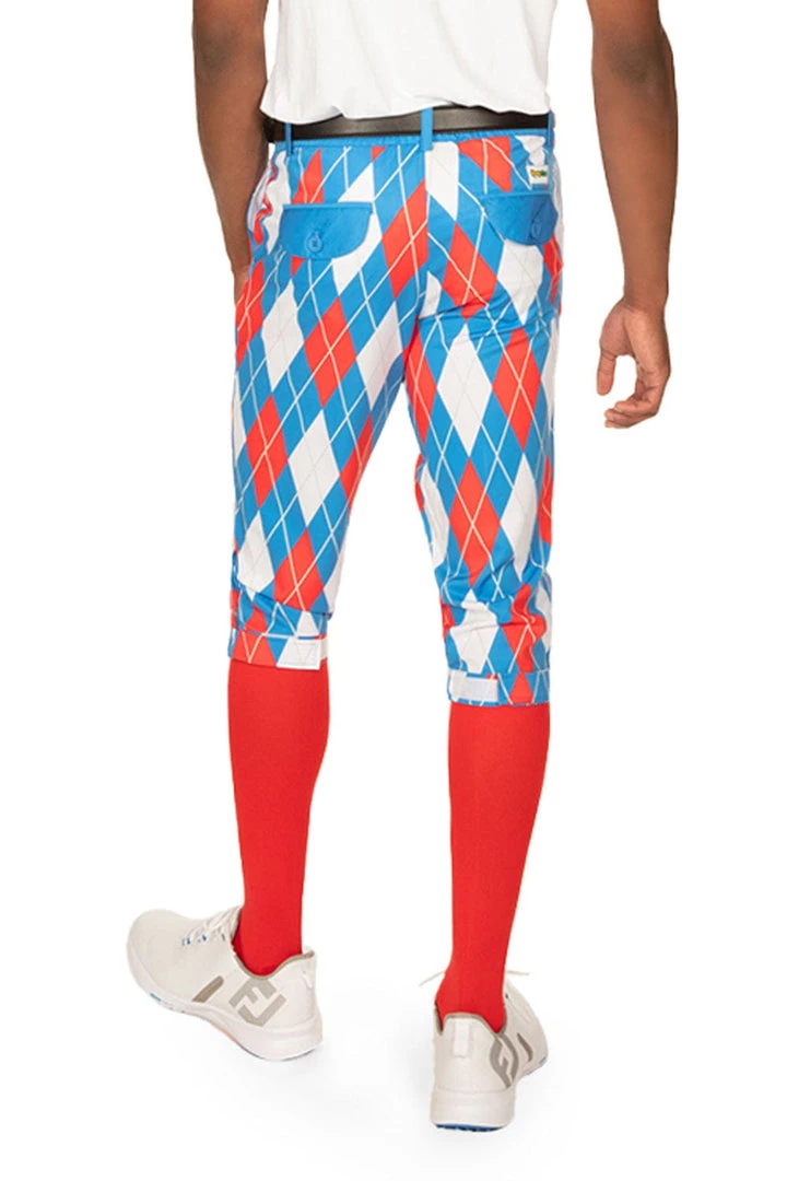 Argyle is a Scottish pattern, and golf is a Scottish sport. But the design on these knickers is 100% American. Step up to that ninth hole with confidence in these comfortable US themed golf pants. With those bright red socks and spiffy white shoes, we’re willing to bet your style handicap just went way down. Red golf socks are included!