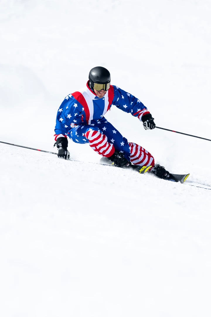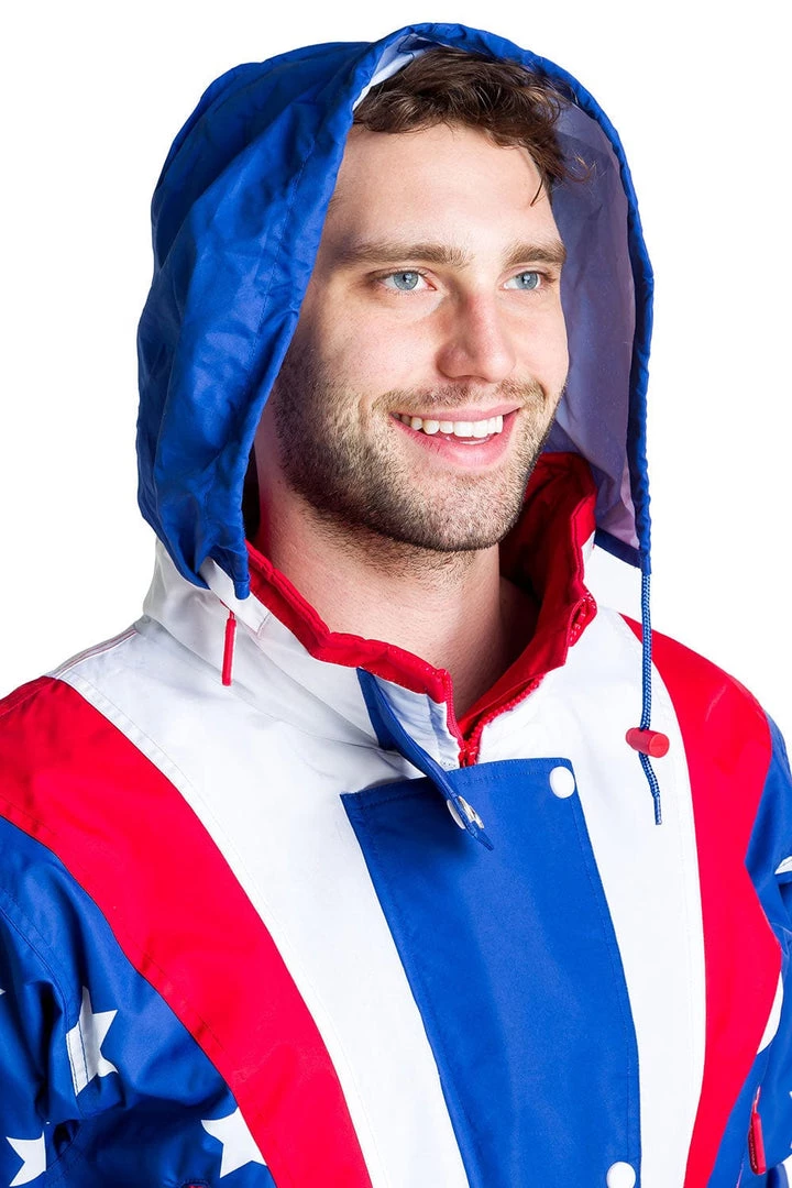 No matter where you may roam in this ski suit, everyone on the slopes will know you are a big fan of the red, white, and blue. In fact, you and your fellow patriots can give each other air high fives on the ski lift. Scratch that. You won’t be riding up any stinkin’ lift. Real Americans walk up the mountain! Excelsior!