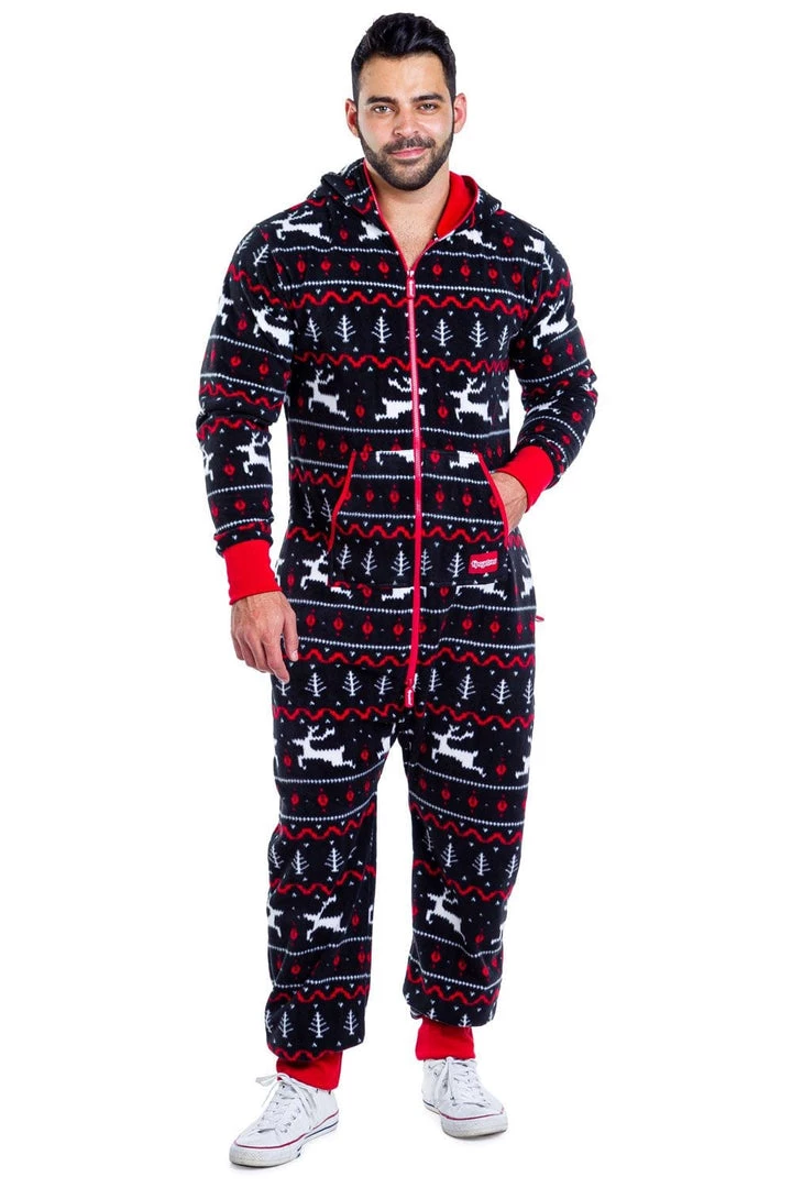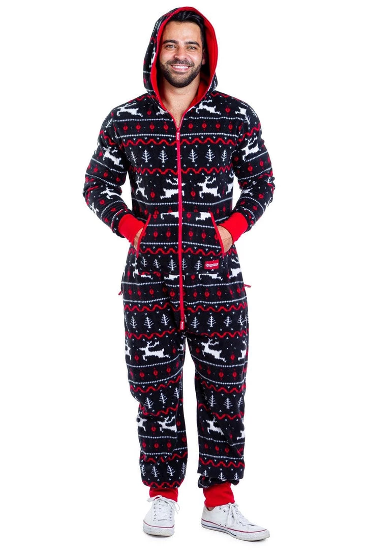 What’s black and red and caribou all over? You in our awesome reindeer onesie. Those little prancing deer are really putting the jump in jumpsuit. It makes us tired just watching them. If you get tired while wearing this outfit, we have good news. It’s perfectly acceptable to wear this piece to bed.