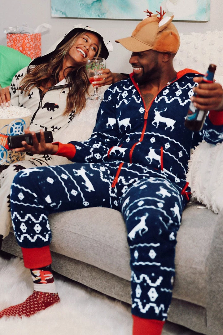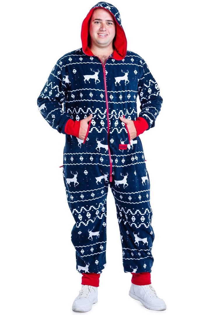 Tired of regular old pajamas? This Christmas themed jumpsuit is perfect for lazing around in during the holidays! The dark blue background is accented with a white Fair Isle pattern scattered with wandering reindeer. The front pockets and zipper closure are trimmed with red piping that is echoed in the lining of the hood.