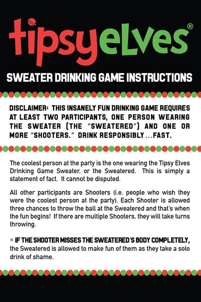 This sweater isn’t just fun for the person wearing it, it’s fun for the whole party! It comes with six velcro balls that will stick to the sweater when thrown. It also comes with a rule card that will lay down the law of the Tipsy Elves Drinking Game. The target is a decent size but as the game goes on, it will become increasingly hard to hit and hopefully that means everyone is having a blast! Check out the back of the sweater for a reminder of the rules and remember to drink responsibly. See how the Drinking Game Sweater works in the video!