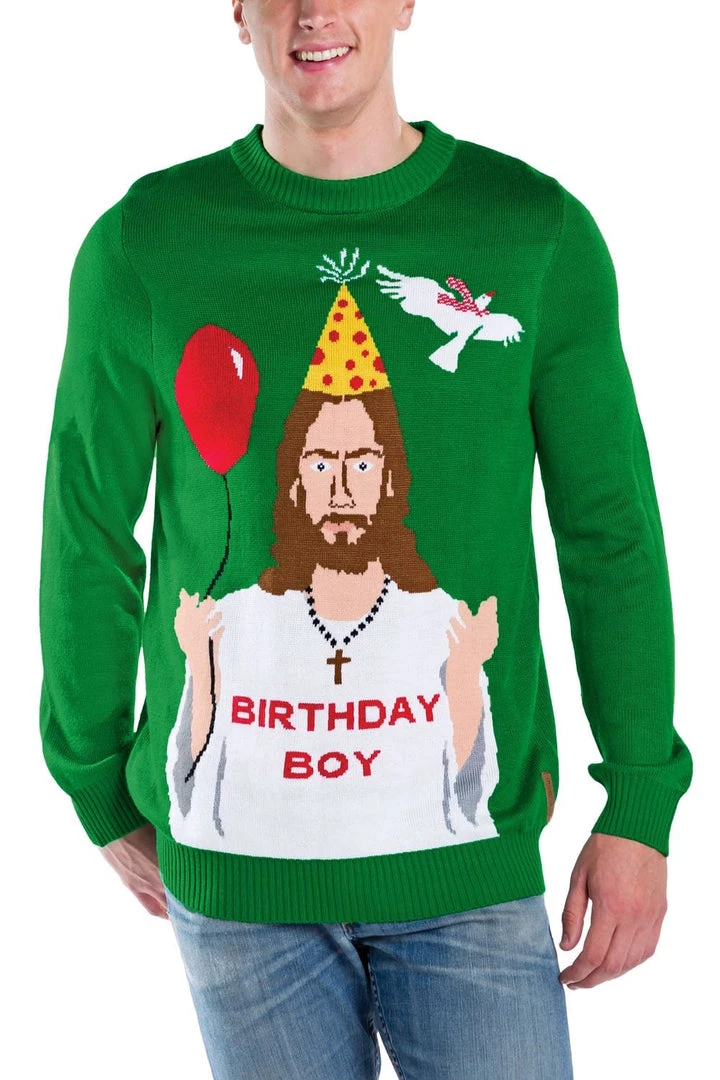 If He’s the reason for the season, it’s time to celebrate! This Christmas sweater features the Son of God himself, complete with a party balloon. A festive white dove with a red ribbon around its neck soars above, while the Birthday Boy stares solemnly from underneath a rakish party hat. This Christmas sweater has a solid green background.