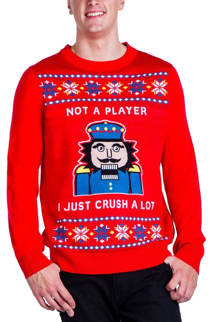 While the rest of us are dressing up like teeny tiny elves, it’s time to get yo playa moves on this Christmas. This year, channel your rapper vibe with our Men’s I Just Crush A Lot ugly Christmas sweater. It blends the modern with the traditional – the humble chestnut cracker with a dusting of hip hop. This sweater might be a little more nut grabbin’ than crackin’, but it’s still every inch the festive one-piece. Wear it to office Christmas parties to delight your musically cultured colleagues. Or just throw it on for Grandma and watch her try figuring it out.