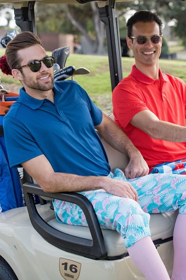 Feel like something subdued to go with our crazy golf knickers? This navy polo will make you look quite respectable from the waist up. It’s fun to pull up in your golf cart looking subdued and then getting out to give everyone a look at your Fairway Flamingo pants or Hot Dog knickers!