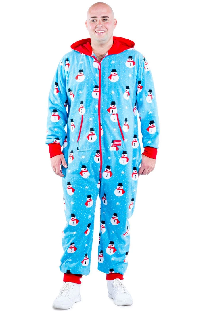 If there’s one guy who’s got more to love, then it’s Frosty the Snowman. This year, embrace your inner Frosty with our Men’s Snowman Is An Island Big and Tall jumpsuit. (Yes, we love the pun too.) This cool blue one-piece looks just like gift wrap, only you’re the present inside. Unwrap yourself easily thanks to the front zipper, or use those front pockets for storing snowballs. We can’t guarantee how long they’ll last. Made for all sizes, this super cute pattern features thousands of our favorite Christmas character bobbing around your torso. It’s also much warmer than going outside. #Winning.