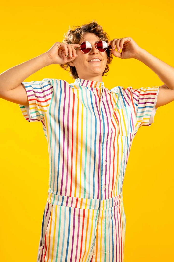 So you heard that life isn’t all sunshine and rainbows? You heard wrong. Find the utmost color in each day with the Men’s Rainbow RompHim! With eye-catching pinstripes laying out each color of the rainbow, you won’t want to be caught in anything else. Why cover up when you could bear all colors?