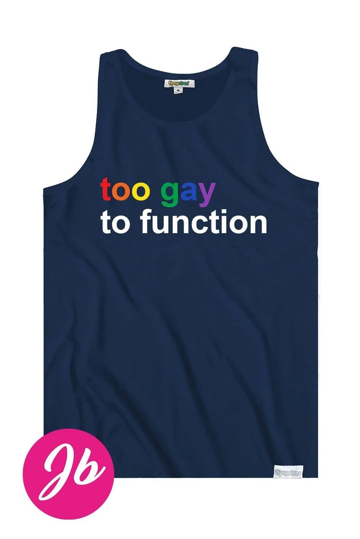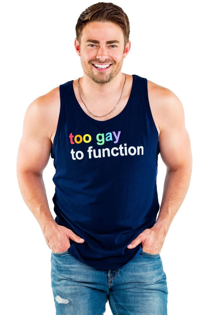 Whoever said being too gay to function was a bad thing, clearly never went to Pride. Functioning is for robots – your mission is to work it, baby. As designed by the true king of early 2000’s pop culture, Jonathan Bennett, this tank top is as lovable as it is quotable. Rock those rainbow colors at Pride or just turn heads next time you go to the mall. It’s yours.
