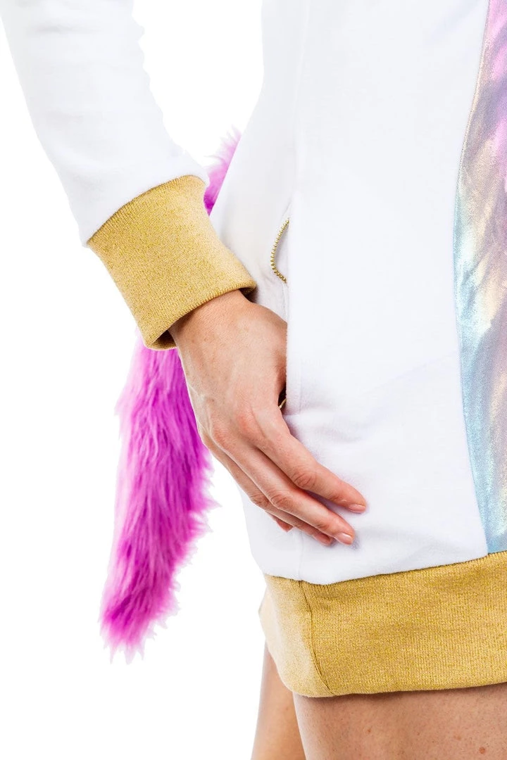 Want to look angelic this Halloween without resorting to a pair of mouse ears? Try the women’s unicorn dress, which offers a floaty and comfortable alternative that won’t have you freezing your horns off. This girls’ unicorn costume is also available as a body suit, but if you’re looking for a more relaxed fit that you can lounge around in the next day, the unicorn dress is for you. Keep the hood down and it’s any other casual autumn dress with a hint of sparkle. Pull the hood up and watch the transformation: this unicorn dress comes with its very own horn and even a princess crown, so you can show your party guests who’s in charge. Bright, flirty and colorful, this fantastical one-piece comes with one large zipper from chest down to the hem of the skirt, allowing you to jump in and out easily like a racing pony.