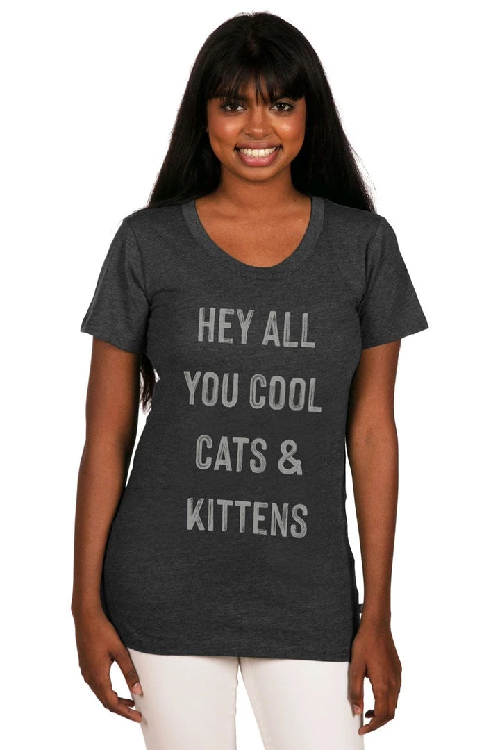 Who let the dogs out? While the mystery remains unsolved, we’re embracing it fully in the Women’s Cool Cats and Kittens Tiger Tee. The dogs are out, and the cats and kittens are in. With this iconic greeting pasted on your tee, the public will know they can safely retract their claws.