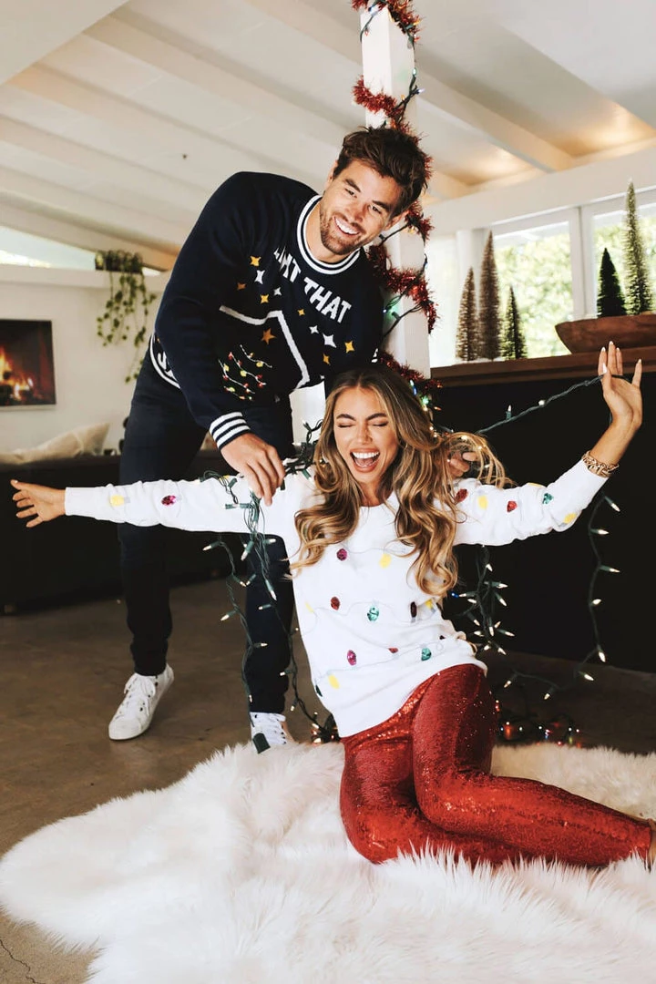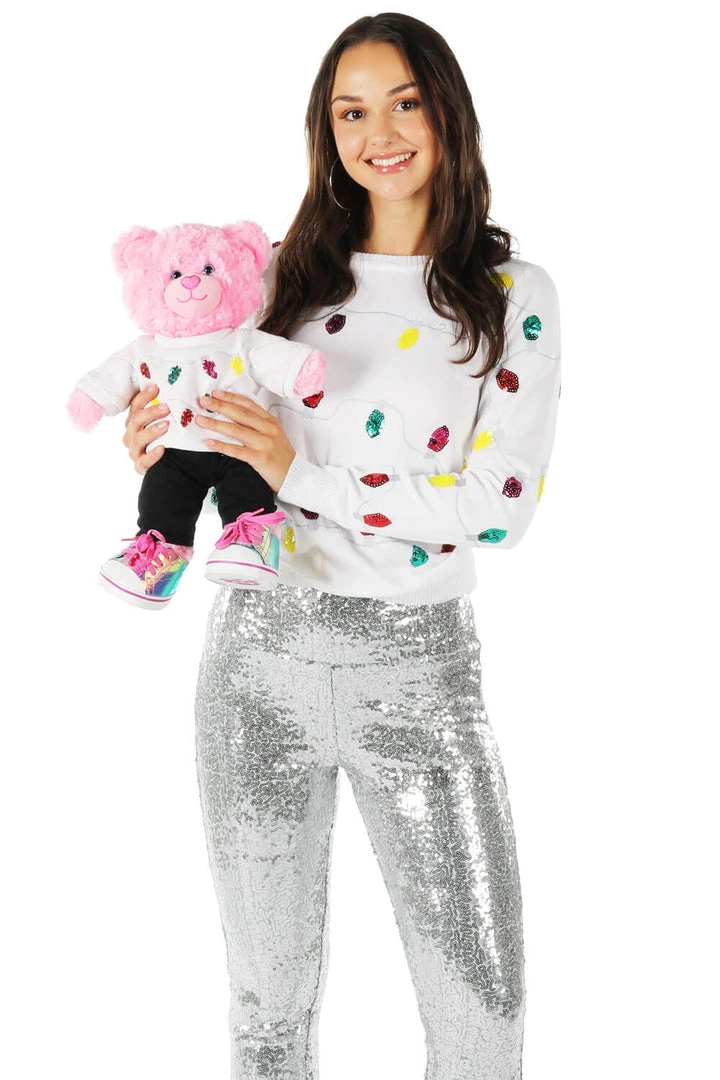 Tis the season – the season of cheer, baked goods, coziness – and lights! Light up your home, your room, your cubicle, you name it. Christmas time calls for strands of lights everywhere, and your outfit is no exception. Tangle up your torso in the lights you so happily deck out your home with in the Women’s Sequin Lights Christmas Sweater! Ultra soft, high-quality and embellished with a sequin sparkle fit to light up any room, you’re set to be the holiday’s brightest light. Now that you’re officially matching your porch, match your favorite paw pal with the matching Sequin Lights Assembled Bear!